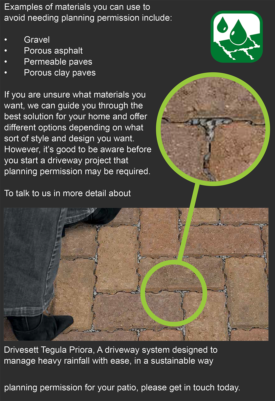 The main reason behind making planning permission a must have, is due to ensuring that water run off is considered and methods are considered to prevent flooding to public roads and neighbouring houses. However, the rules around planning permission are quite complex – it can be dependant on the materials you choose and the style of your home, for example if you live in a listed building you will definitely need planning permission. But if you don't live in a listed building and you choose certain materials for your driveway you can be exempt from needing permission.